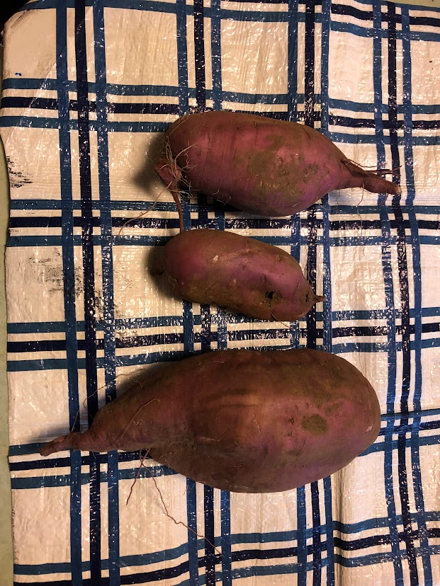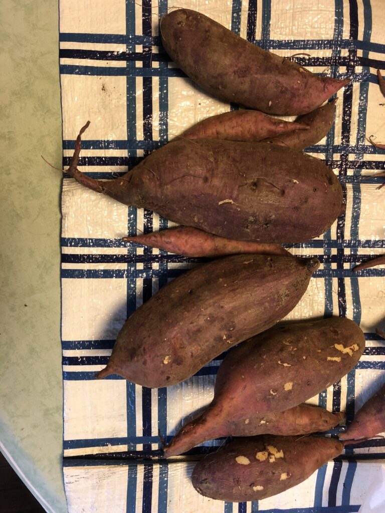 雨が少ない暑い夏だったため、心配していましたが、成長は良好でした。紅はるかは3株で平均1.8㎏。紫芋(パープルスィートロード)は2.2㎏でした。今年は天候のせいで丸いいもが多いと聞いていました。細長くてきれいな形で、虫にも食べられていませんでした。まだまだ暖かい日が続くので、当園では、ギリギリまで大きくして皆様にお分けしたいと思っています。